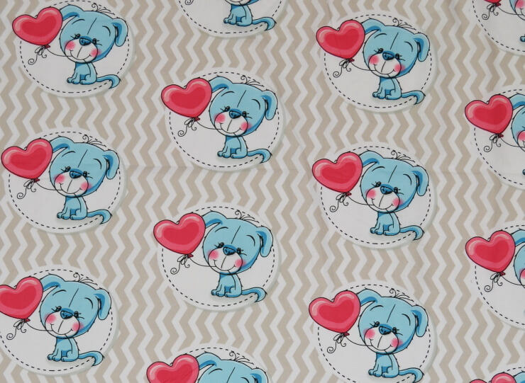 Bavlněná dětská látka pejsci s balónky, z této krásné a levné dětské bavlněné látky lze ušít jakýkoliv výrobek např. dětský polštářek, dětské povlečení, deku, rychlozavinovačku, mantinel, kapsář na postýlku, hnízdečko pro miminko, dětskou zástěrku, vložku do kočárku popřípadě prostěradlo do kočárku a mnoho dalšího…