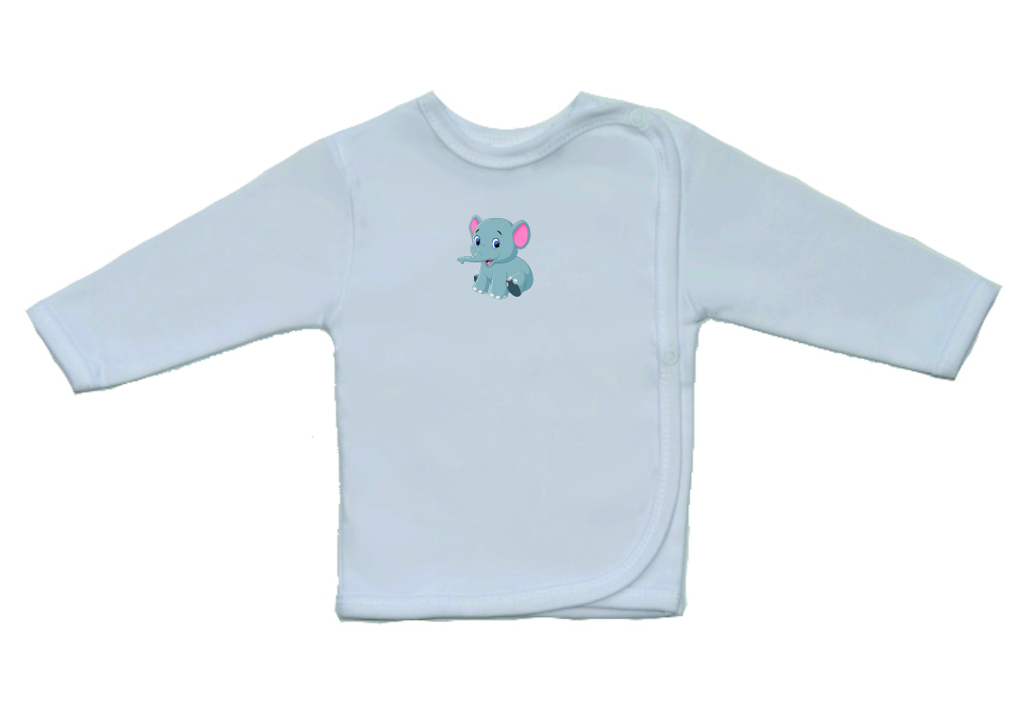 Kojenecká košilka Gama bílá spotiskem obrázku, sedící slon, v menším provedení, je krásná a velmi kvalitní košilka pro miminko zdobená menším obrázkem. Boční zapínání na cvočky po celé délce usnadňuje oblékání košilky miminku.