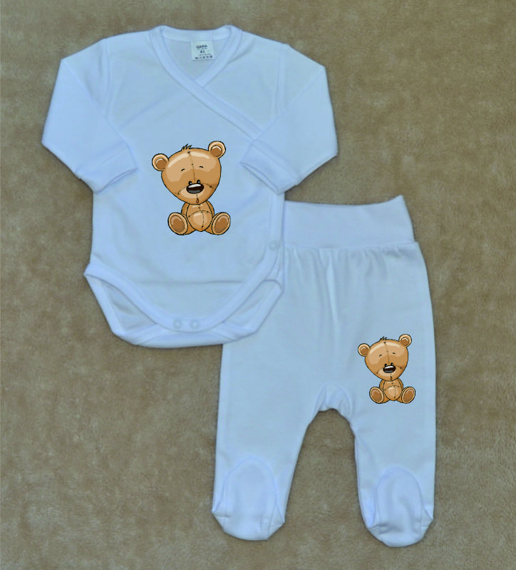 Bílá kojenecká soupravička Gama, hnědý Medvídek, zavinovací body+polodupačky, je krásná, vysoce kvalitní, svým potiskem decentní, 2-dílná bílá kojenecká soupravička pro miminko, která je vyrobená ze 100% velmi jemné, kojenecké, velmi příjemné, atestované bavlny, vhodné pro miminka.