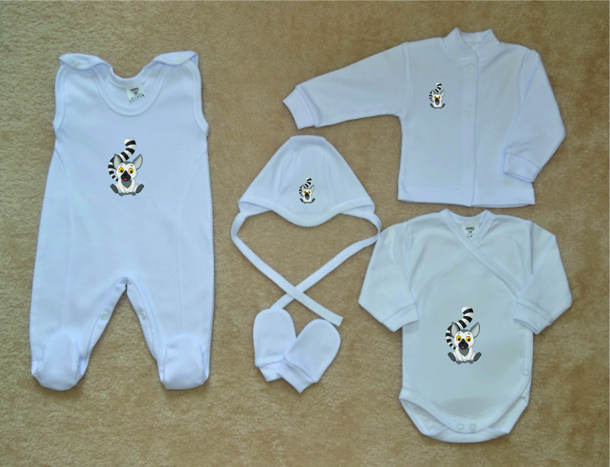 Bílá kojenecká soupravička pro miminko do porodnice Gama, DELUXE, lemur, je krásná, vysoce kvalitní, svým potiskem decentní, 5-dílná kojenecká soupravička pro miminko, která je vyrobená ze 100% velmi jemné, kojenecké, velmi příjemné, atestované bavlny, vhodné pro miminka.