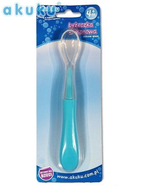 Dětská silikonová lžička, Akuku, modrá, je barevná silikonová lžička, která je ideální pro bezpečné a pohodlné krmení dítěte. Má praktický tvar a měkkou koncovku, která mimo jiné umožňuje důkladné nabrání pokrmu z nádoby či skleničky. Určeno pro děti od 4 měsíců.