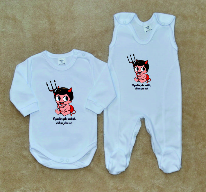 Kojenecká/dětská soupravička Gama, bílá s obrázkem a českým nápisem, Vypadám jako andílek, zlobím jako čert! je krásná, vysoce kvalitní, svým potiskem decentní, 2-dílná kojenecká soupravička pro miminko, která je vyrobená ze 100% velmi jemné, kojenecké, velmi příjemné, atestované bavlny, vhodné pro miminka.