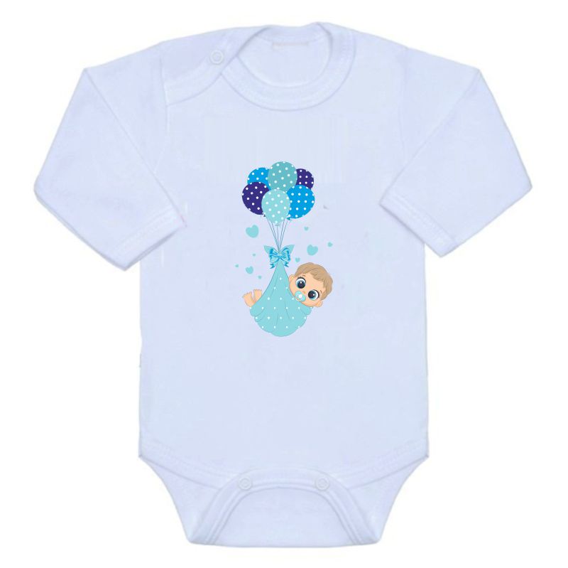 Kojenecké/dětské body s velkým obrázkem miminka chlapeček s balónky, je bavlněné kojenecké/dětské body s dlouhým rukávem, v bílé barvě s potiskem obrázku ve velkém provedení.