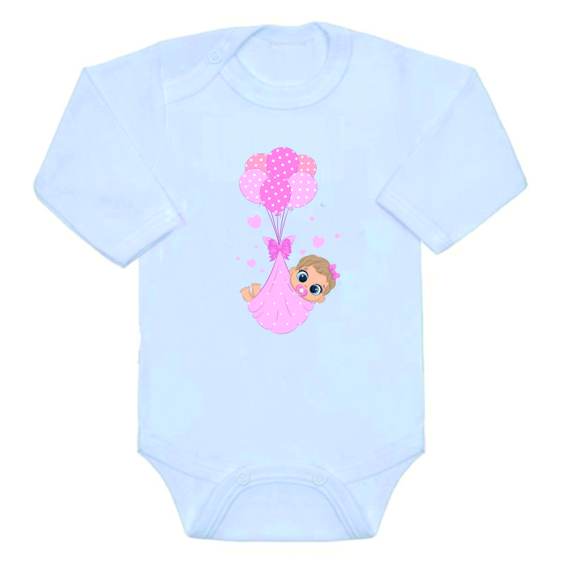 Kojenecké/dětské body s velkým obrázkem holčičího miminka s balónky, je bavlněné kojenecké/dětské body s dlouhým rukávem, v bílé barvě s potiskem obrázku ve velkém provedení.