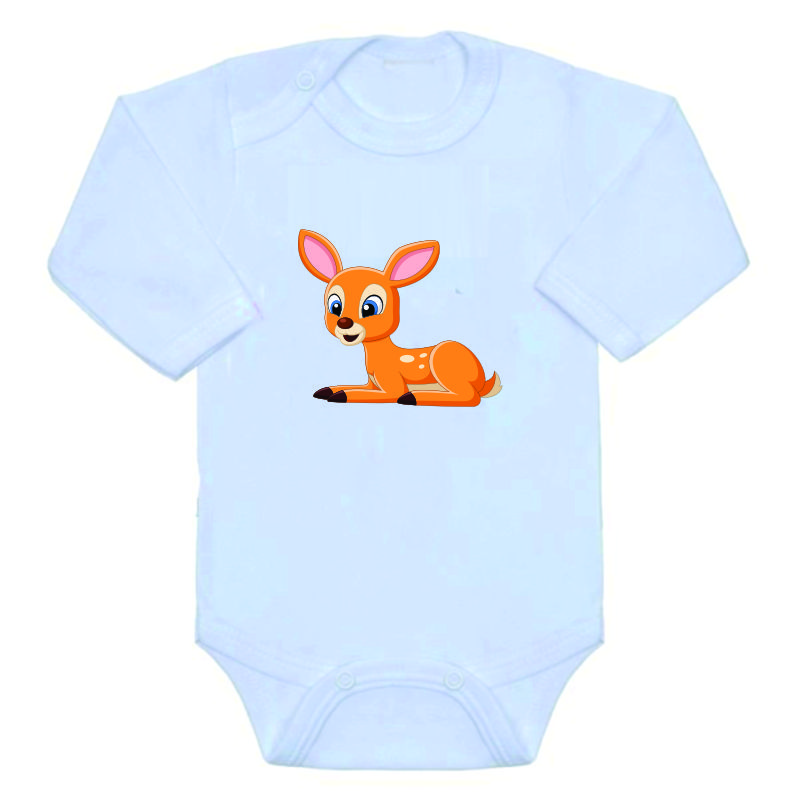 Kojenecké/dětské body s velkým roztomilým obrázkem, sedící srnka, je bavlněné kojenecké/dětské body s dlouhým rukávem, v bílé barvě s potiskem obrázku ve velkém provedení.