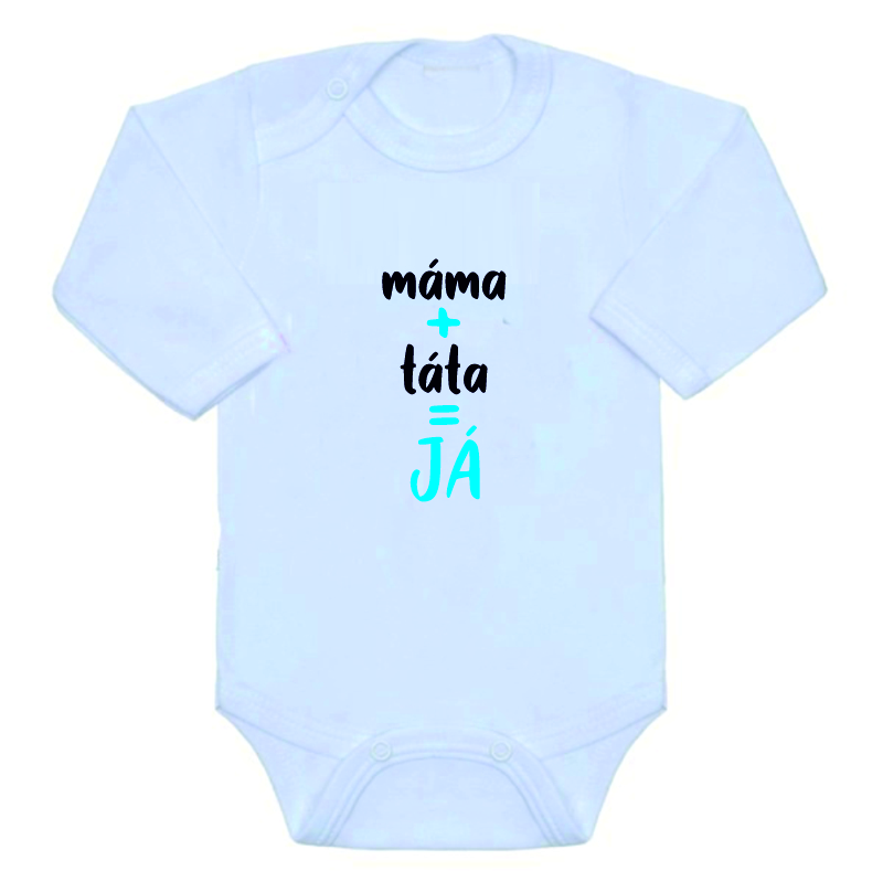 Dětské body s potiskem Gama máma+táta=Já, bílé s tyrkysovým nápisem vel.86Skladem v e-shopu230 Kč/ ks190 Kč bez DPH