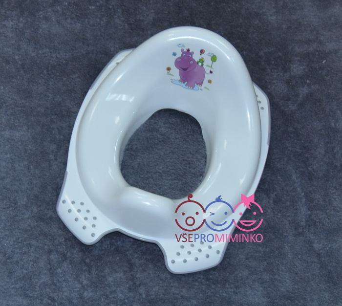 Dětské sedátko na WC Prima Baby kolekce Hippo, usnadňuje dítěti přechod z nočníku na klasickou toaletu. Dětské sedátko na WC je univerzální na všechny toalety a díky protiskluzové úpravě která je dle nabídky výrobce v šedé či fialové barvě (na základě aktuální výroby), pevně drží a protiskluz taktéž tlumí tření plastových desek, jak o mísu toalety tak originální wc desky o adaptér.