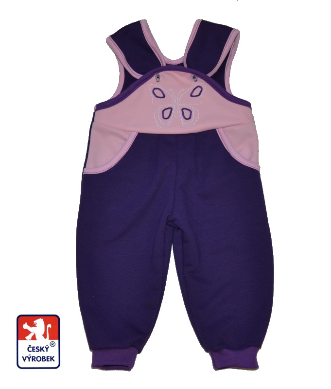 Dětské tepláčky s laclem, Dětský svět, fialovorůžové s motýlkem. Dětské tepláčky s laclem/zahradníčky jsou nepostradatelné oblečení pro lozící děti, které díky velmi pohodlnému a praktickému, léty ověřenému střihu nebudou mít při lození a hátkách holá záda...super i na pískoviště. Tepláčky jsou vyrobeny z velmi příjemné, atestované, teplákoviny ze 100% bavlny.