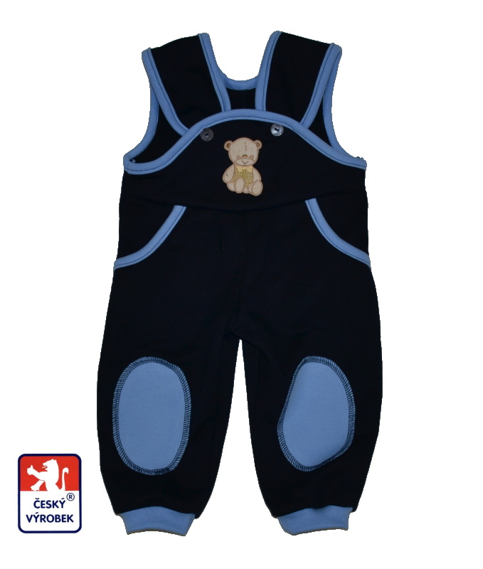 - Dětské tepláčky s laclem a záplatami Dětský svět tmavě modré s medvídkem ve vestě vel.104