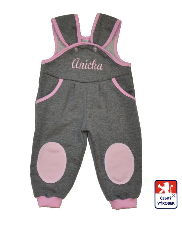 Dětské laclové tepláčky se jménem, šedorůžové zahradníčky se záplatami jsou výrobek z naší dílny Dětský svět Fulnek