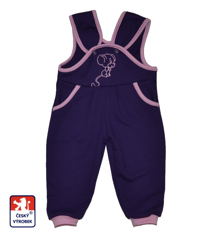 Dětské tepláčky zahradníky, fialové s myškou jsou výrobek z našich dílen Dětský svět Fulnek
