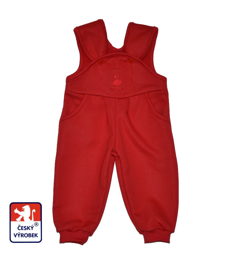 Dětské tepláčky se šráčky a laclem, Dětský svět, červené s medvídkem, jsou nepostradatelné oblečení pro lozící děti, které díky velmi pohodlnému a praktickému, léty ověřenému střihu nebudou mít při lození a hrátkách holá záda...super i na pískoviště.