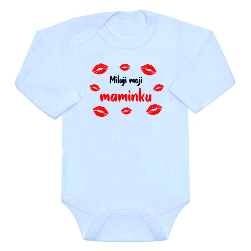 Dětské vtipné body s velkým obrázkem a vtipným nápisem, Miluji moji maminku, je bavlněné dětské body s dlouhým rukávem v bílé barvě s potiskem obrázku a vtipného textu ve velkém provedení.