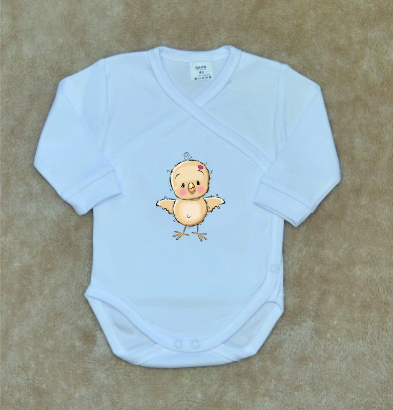 Dětské zavinovací body Gama, bílé s kuřátkem, je nádherné bavlněné dětské body s dlouhým rukávem, v bílé barvě a potiskem velmi kvalitného obrázku ve velkém provedení.