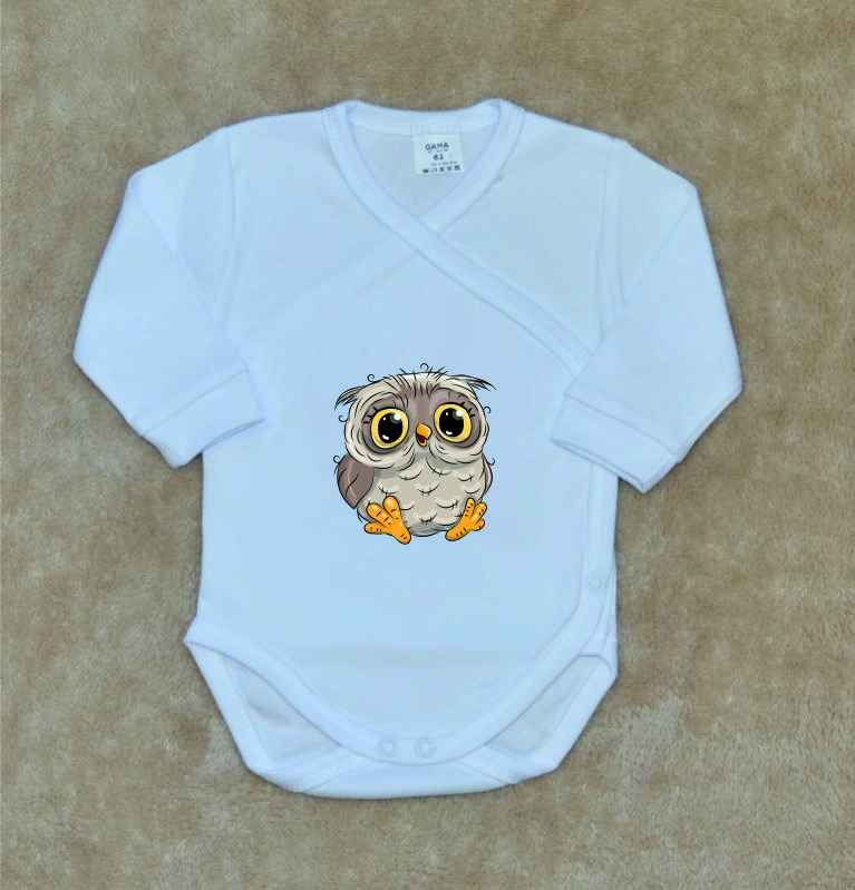 Dětské zavinovací body Gama, bílé se sovičkou, je nádherné bavlněné dětské body s dlouhým rukávem, v bílé barvě a potiskem velmi kvalitného obrázku ve velkém provedení.