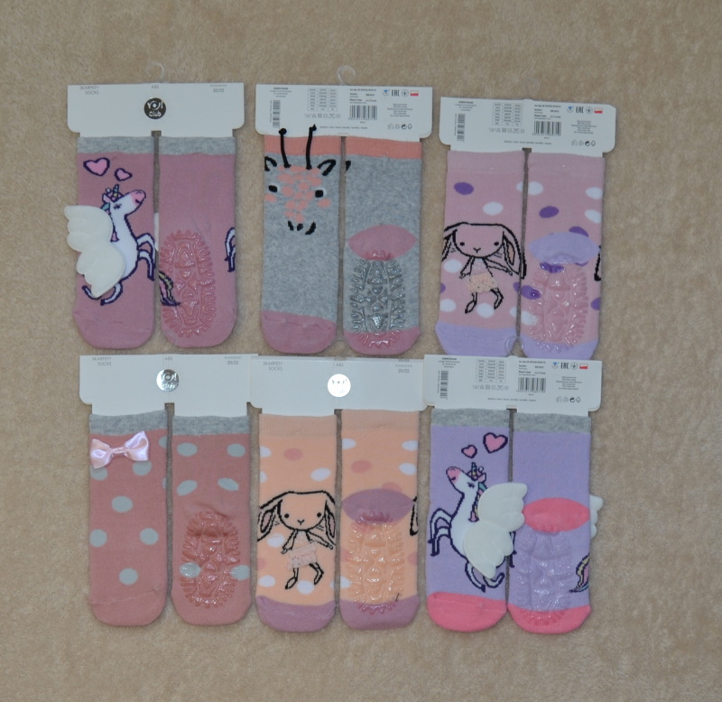 Dětské bavlněné ponožky mají protiskluzovou úpravu ABS a 3D aplikaci (jednorožec má křídla, králíček sukýnku, mašlička, žirafa má růžky).