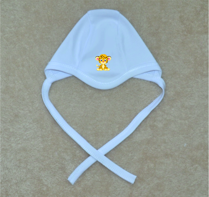 Kojenecká bavlněná čepička pro miminko Gama bílá s obrázkem, gepard, je vyrobená z vysoce jemného, 100% bavlněného, atestovaného mako materiálu se zavazováním.