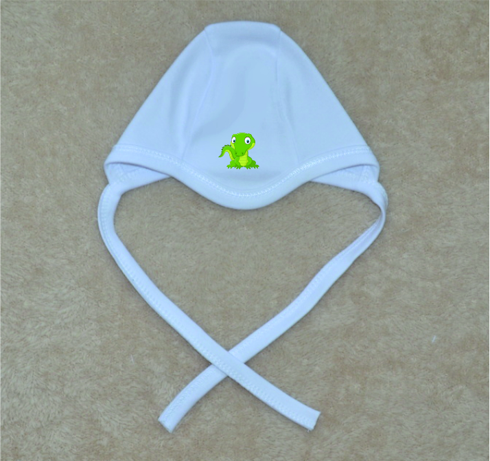 Kojenecká bavlněná čepička pro miminko Gama bílá s obrázkem, krokodýl, je vyrobená z vysoce jemného, 100% bavlněného, atestovaného mako materiálu se zavazováním.