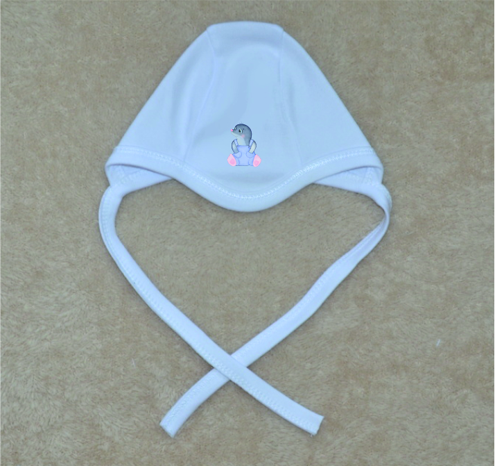 Kojenecká bavlněná čepička pro miminko Gama bílá s obrázkem, krteček tmavý, je vyrobená z vysoce jemného, 100% bavlněného, atestovaného mako materiálu se zavazováním.