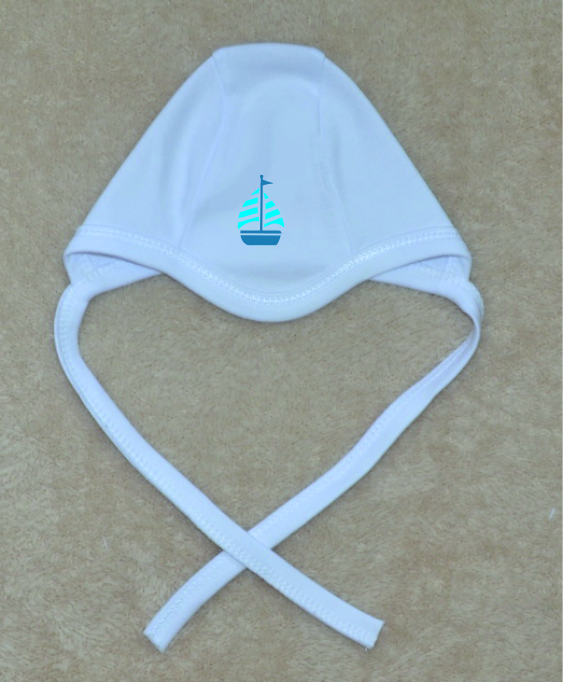 Kojenecká bavlněná čepička pro miminko Gama bílá s obrázkem, loďka, je vyrobená z vysoce jemného, 100% bavlněného, atestovaného mako materiálu se zavazováním.