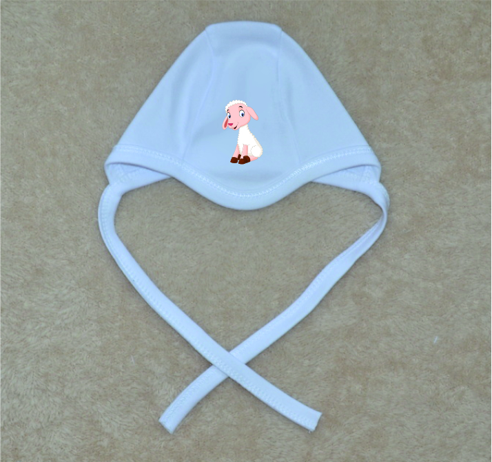 Kojenecká bavlněná čepička pro miminko Gama bílá s obrázkem, ovečka, je vyrobená z vysoce jemného, 100% bavlněného, atestovaného mako materiálu se zavazováním.