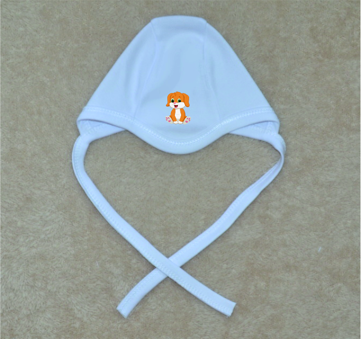 Kojenecká bavlněná čepička pro miminko Gama bílá s obrázkem, pejsek, je vyrobená z vysoce jemného, 100% bavlněného, atestovaného mako materiálu se zavazováním.