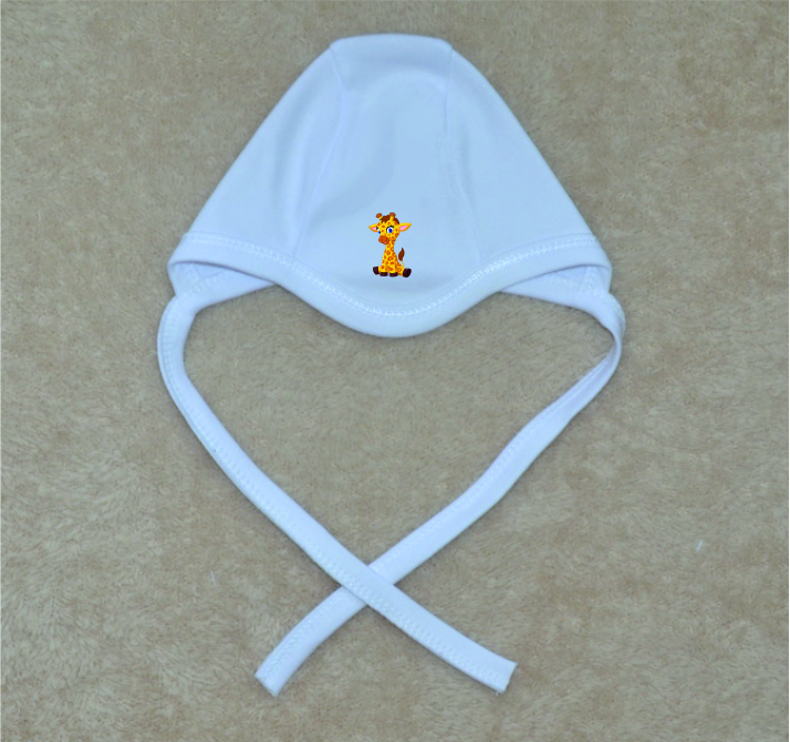 Kojenecká bavlněná čepička pro miminko Gama bílá s obrázkem, roztomilá žirafa, je vyrobená z vysoce jemného, 100% bavlněného, atestovaného mako materiálu se zavazováním.