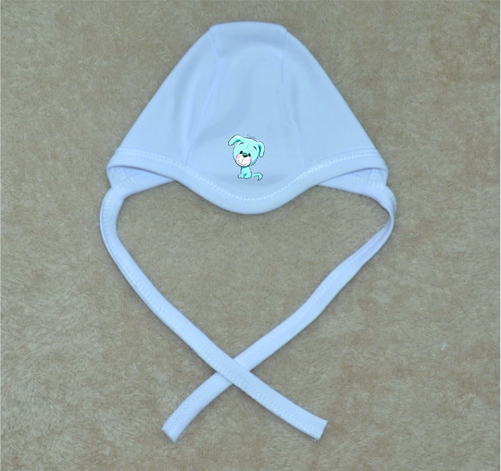 Kojenecká bavlněná čepička pro miminko Gama bílá s obrázkem, roztomilý modrý pejsek, je vyrobená z vysoce jemného, 100% bavlněného, atestovaného mako materiálu se zavazováním.