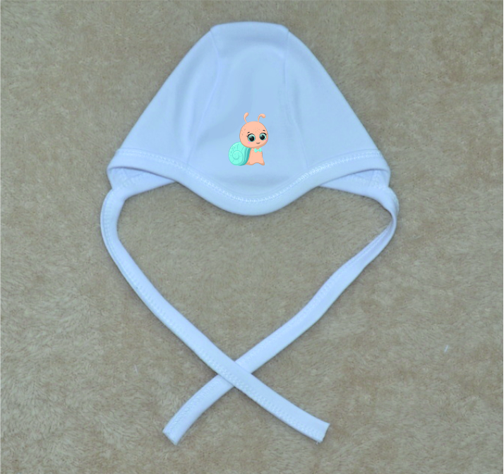 Kojenecká bavlněná čepička pro miminko Gama bílá s obrázkem, šnek modrý, je vyrobená z vysoce jemného, 100% bavlněného, atestovaného mako materiálu se zavazováním.