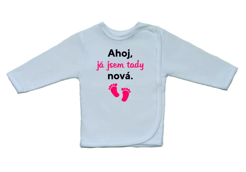 Kojenecká košilka s legračním potiskem, Gama, bílá s větším potiskem Ahoj, já jsem tady nová, je krásná a velmi kvalitní košilka pro miminko, zdobená vtipným textem ve větším formátu. Boční zapínání na cvočky po celé délce usnadňuje oblékání košilky miminku.