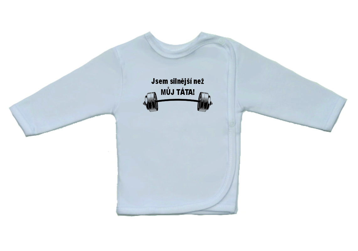 Kojenecká košilka, Gama, bílá s větším potiskem obrázku a nápisem, jsem silnější než můj táta, je krásná a velmi kvalitní košilka pro miminko, zdobená krásným obrázkem a nápisem ve větším formátu. Boční zapínání na cvočky po celé délce usnadňuje oblékání košilky miminku.