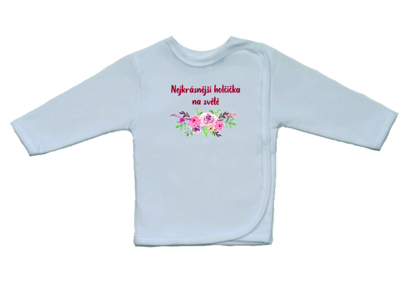 Dětská košilka s potiskem, Gama, bílá s větším obrázkem a nápisem Nejkrásnější holčička na světě, je krásná a velmi kvalitní košilka pro miminko, zdobená velkým vtipným nápisem. Boční zapínání na cvočky po celé délce usnadňuje oblékání košilky miminku.