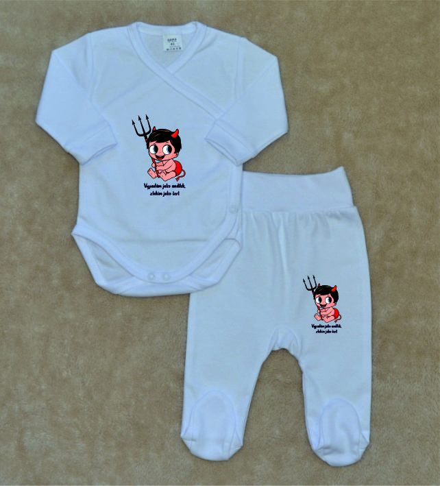 Bílá kojenecká soupravička Gama, Vypadám jako andílek, zlobím jako čert, zavinovací body+polodupačky, je krásná, vysoce kvalitní, svým potiskem decentní, 2-dílná bílá kojenecká soupravička pro miminko, která je vyrobená ze 100% velmi jemné, kojenecké, velmi příjemné, atestované bavlny, vhodné pro miminka.