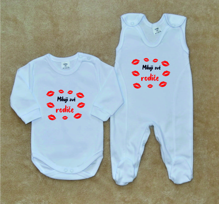 Kojenecká/dětská soupravička Gama, bílá s obrázkem a českým nápisem, Miluji své rodiče, je krásná, vysoce kvalitní, svým potiskem decentní, 2-dílná kojenecká soupravička pro miminko, která je vyrobená ze 100% velmi jemné, kojenecké, velmi příjemné, atestované bavlny, vhodné pro miminka.
