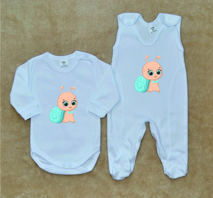 Kojenecká/dětská soupravička Gama, bílá s obrázkem šnečka, je krásná, vysoce kvalitní, svým potiskem decentní, 2-dílná kojenecká soupravička pro miminko, která je vyrobená ze 100% velmi jemné, kojenecké, velmi příjemné, atestované bavlny, vhodné pro miminka.