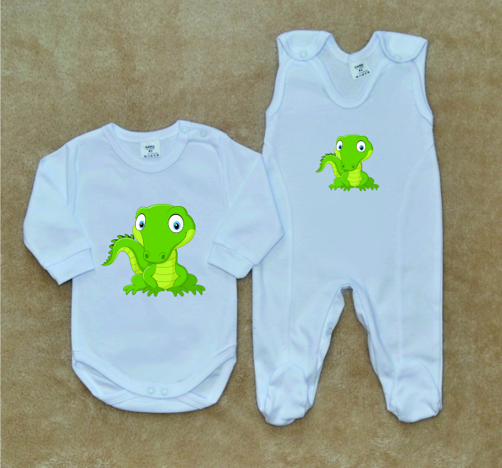 Kojenecká soupravička Gama, bílá s obrázkem sedící krokodýl, je krásná, vysoce kvalitní, svým potiskem decentní, 2-dílná kojenecká soupravička pro miminko, která je vyrobená ze 100% velmi jemné, kojenecké, velmi příjemné, atestované bavlny, vhodné pro miminka.