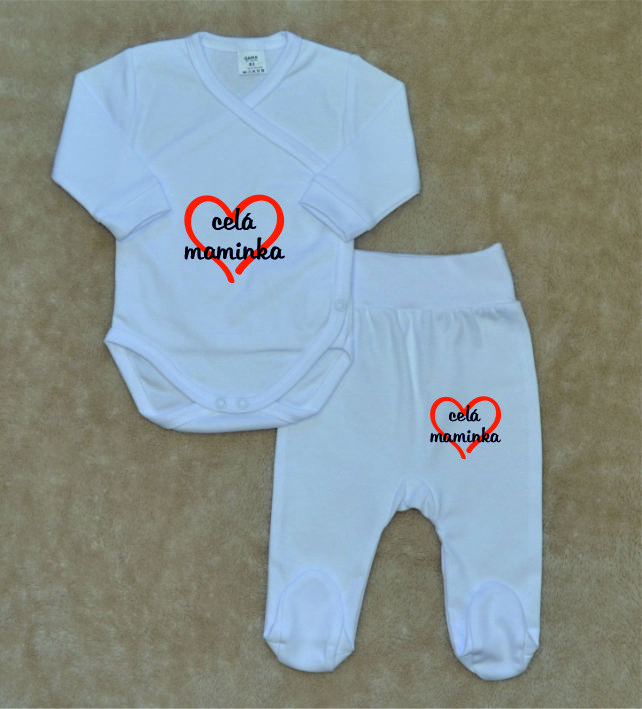 Bílá kojenecká soupravička Gama, celá maminka, zavinovací body+polodupačky, je krásná, vysoce kvalitní, svým potiskem decentní, 2-dílná bílá kojenecká soupravička pro miminko, která je vyrobená ze 100% velmi jemné, kojenecké, velmi příjemné, atestované bavlny, vhodné pro miminka.