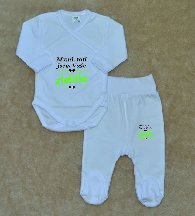 Bílá kojenecká soupravička Gama, mami, tati jsem vaše zlatíčko, zavinovací body+polodupačky, je krásná, vysoce kvalitní, svým potiskem decentní, 2-dílná bílá kojenecká soupravička pro miminko, která je vyrobená ze 100% velmi jemné, kojenecké, velmi příjemné, atestované bavlny, vhodné pro miminka.