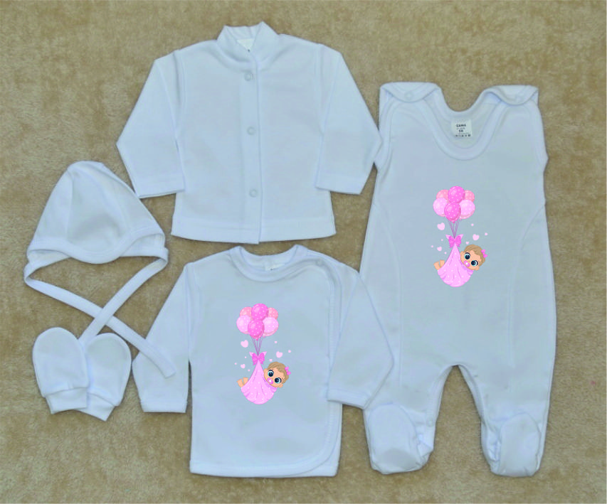 Kojenecká soupravička pro miminko, Gama, miminko holčička s balónky, je krásná, vysoce kvalitní, svým potiskem decentní, 5-dílná kojenecká soupravička pro miminko, která je vyrobená ze 100% velmi jemné, kojenecké, velmi příjemné, atestované bavlny, vhodné pro miminka.