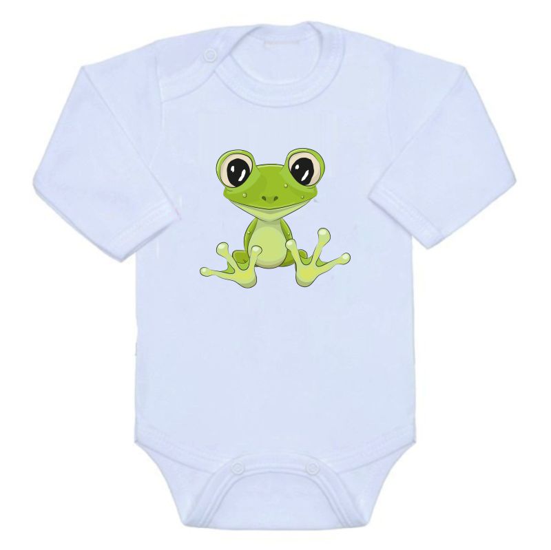 Kojenecké/dětské body s velkým obrázkem roztomilé žabičky, je bavlněné kojenecké/dětské body s dlouhým rukávem, v bílé barvě s potiskem obrázku ve velkém provedení.