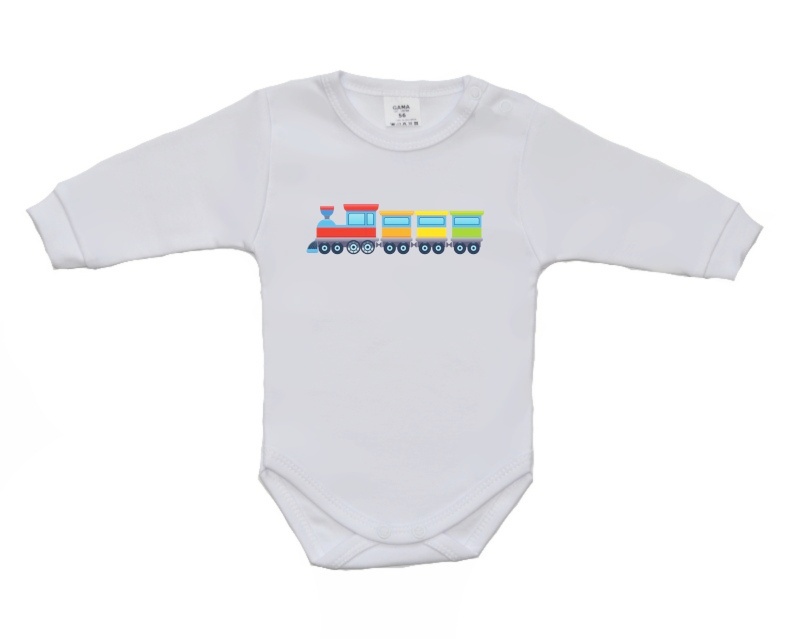 Kojenecké/dětské body s velkým obrázkem vláčku, je bavlněné kojenecké/dětské body s dlouhým rukávem, v bílé barvě s potiskem obrázku ve velkém provedení.