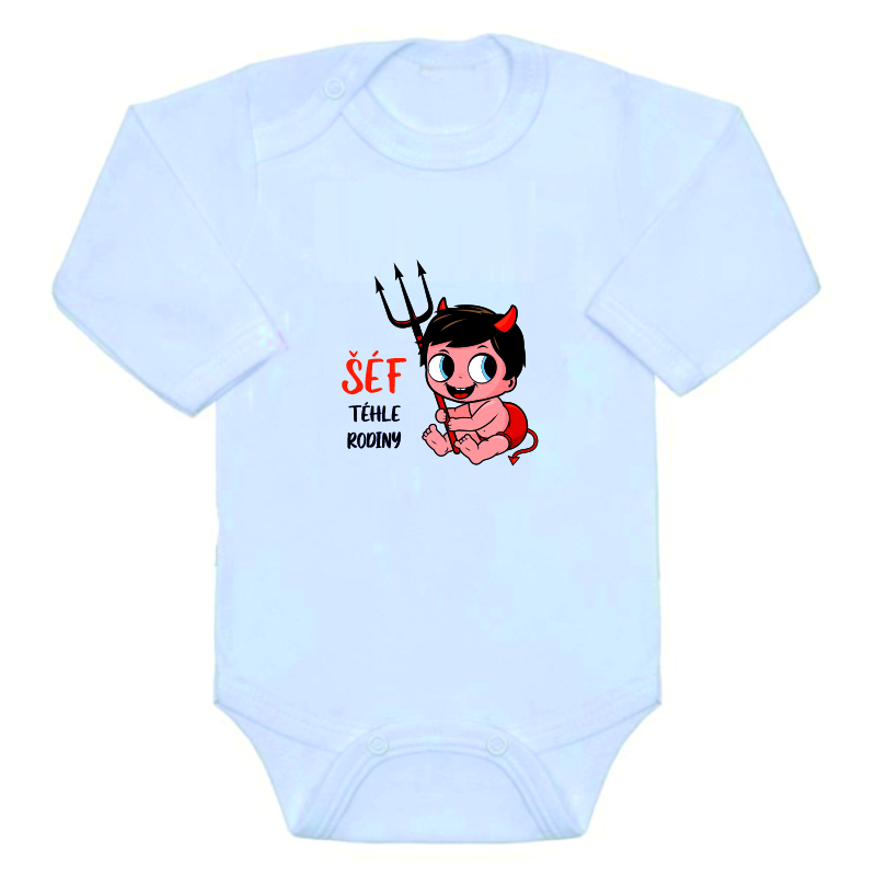 Kojenecké/dětské vtipné body s obrázkem a vtipným nápisem, Šéf téhle rodiny, je bavlněné dětské body s dlouhým rukávem v bílé barvě s potiskem obrázku a vtipného textu. Vtipný potisk a obrázek je na dětské body natištěn v nejmodernější speciální digitální formě, což zajistí, že body je stále heboučké a měkké a obrázek nevytvoří hrubší plochu jako výšivka či jiný druh potisku a je prodyšný.