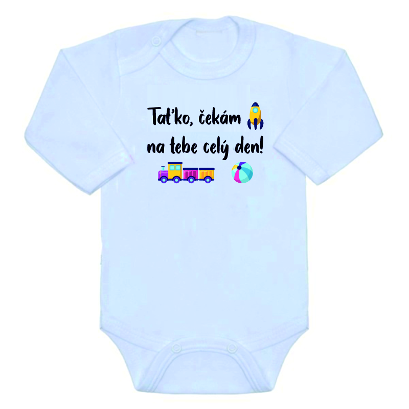 Kojenecké/dětské vtipné body s obrázkem a vtipným nápisem, taťko čekám na tebe celý den, je bavlněné dětské body s dlouhým rukávem v bílé barvě s potiskem obrázku a vtipného textu. Vtipný potisk a obrázek je na dětské body natištěn v nejmodernější speciální digitální formě, což zajistí, že body je stále heboučké a měkké a obrázek nevytvoří hrubší plochu jako výšivka či jiný druh potisku a je prodyšný.