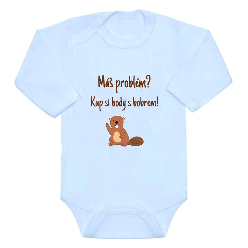 Kojenecké/dětské vtipné body s obrázkem a vtipným nápisem, Máš problém? Kup si body s bobrem, je bavlněné dětské body s dlouhým rukávem v bílé barvě s potiskem obrázku a vtipného textu. Vtipný potisk a obrázek je na dětské body natištěn v nejmodernější speciální digitální formě, což zajistí, že body je stále heboučké a měkké a obrázek nevytvoří hrubší plochu jako výšivka či jiný druh potisku a je prodyšný.