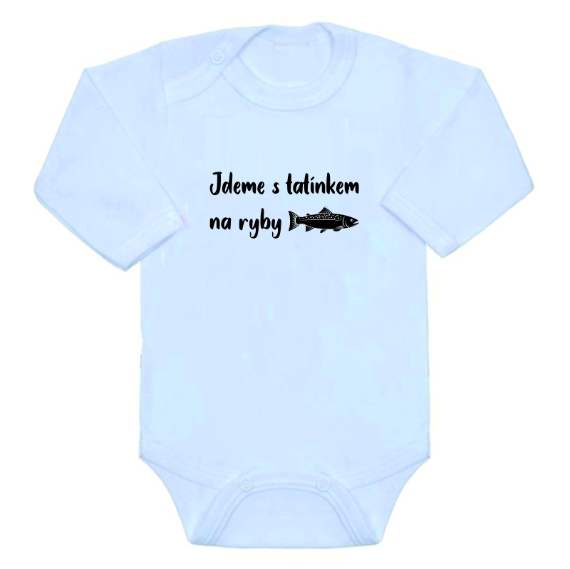 Kojenecké/dětské vtipné body s obrázkem a vtipným nápisem, jdeme s tatínek na ryby, je bavlněné dětské body s dlouhým rukávem v bílé barvě s potiskem obrázku a vtipného textu. Vtipný potisk a obrázek je na dětské body natištěn v nejmodernější speciální digitální formě, což zajistí, že body je stále heboučké a měkké a obrázek nevytvoří hrubší plochu jako výšivka či jiný druh potisku a je prodyšný.
