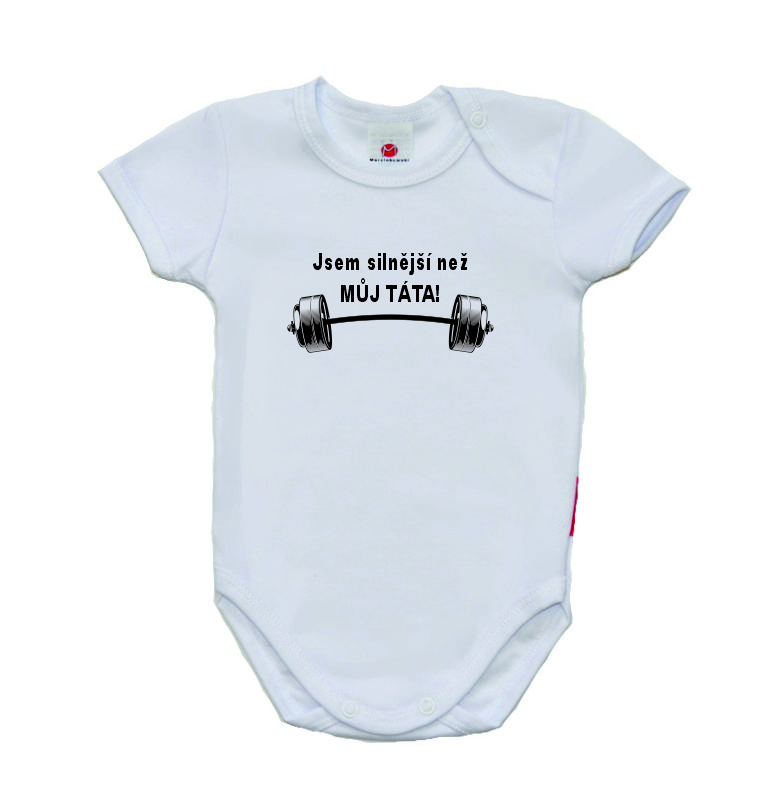 Kojenecké/dětské vtipné body s potiskem, jsem silnější než můj táta, je nádherné bavlněné dětské body, které je velmi příjemné na nošení s vtipným potiskem. Zdravotně nezávadný obrázek je na dětské body natištěn v nejmodernější speciální digitální formě, což zajistí, že body je stále heboučké a měkké a obrázek nevytvoří hrubší plochu jako výšivka či jiný druh potisku a je prodyšný a je velmi vhodný na výrobky pro miminka.