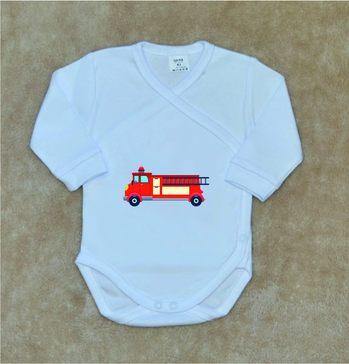 Kojenecké zavinovací body Gama, bílé s obrázkem Hasiči, je nádherné bavlněné kojenecké body s dlouhým rukávem, v bílé barvě a potiskem velmi kvalitního obrázku ve velkém provedení.