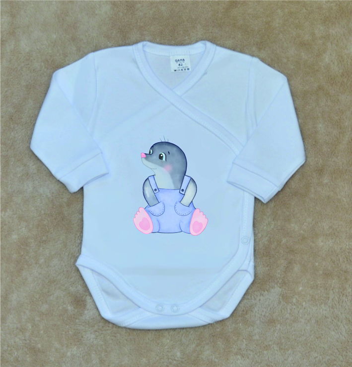 Kojenecké zavinovací body Gama, bílé s obrázkem krtečka obrysy, je nádherné bavlněné kojenecké body s dlouhým rukávem, v bílé barvě a potiskem velmi kvalitního obrázku ve velkém provedení.
