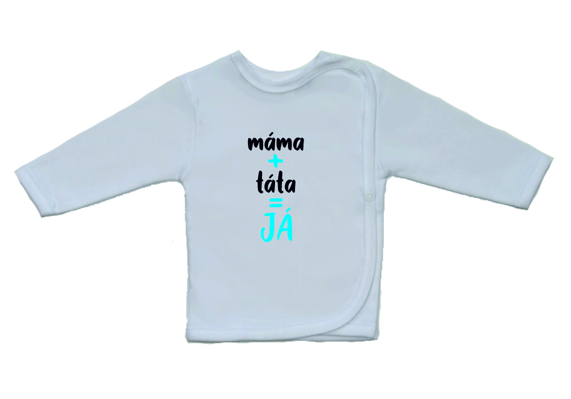 Košilka pro miminko, Gama, bílá s větším českým nápisem Máma+Táta=Já, je krásná a velmi kvalitní košilka pro miminko, zdobená obrázkem ve větším formátu. Boční zapínání na cvočky po celé délce usnadňuje oblékání košilky miminku.