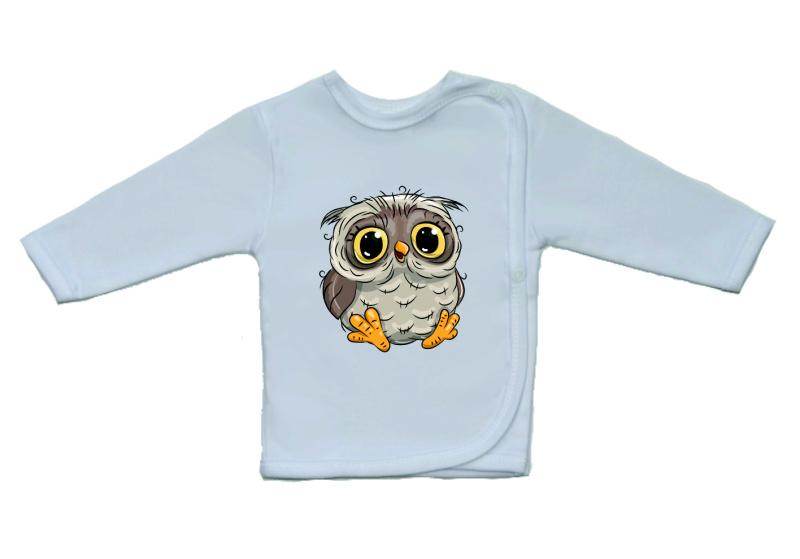 Novorozenecká košilka, Gama, bílá s větším obrázkem roztomilé šedé sovičky, je krásná a velmi kvalitní košilka pro miminko, zdobená obrázkem ve větším formátu. Boční zapínání na cvočky po celé délce usnadňuje oblékání košilky miminku.